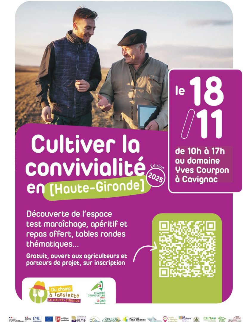 L’ADAR de Haute-Gironde et la Démarche Alimentaire Territoriale, ainsi que leurs partenaires, ont le plaisir d’inviter les agriculteurs de Haute Gironde à la seconde édition de la Journée de convivialité agricole, qui aura lieu le 18 novembre 2025 à Cavignac. Ce temps de rencontre et d’échanges vise à créer du lien et à faire avancer les projets agricoles du territoire.
